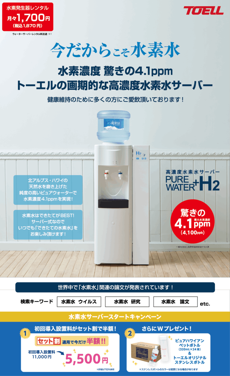 健康と美容に人気の水素水サーバーが、大変おトクに始められる期間限定キャンペーンを実施中です。